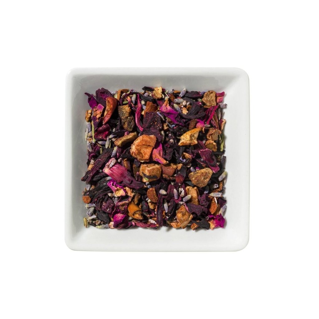 Ibišek květ, Jablko kousky, Hruška kousky, Červená řepa kousky, Levandule květ, Skořice, přírodní aroma, Růže okvětí