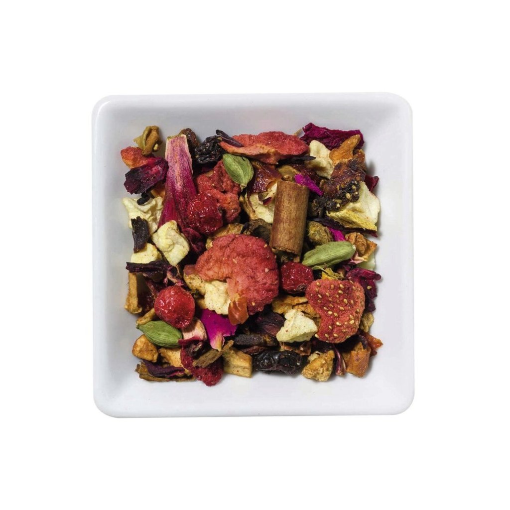 Jablko kousky, Rozinky, Ibišek květ, Skořice kůra, Šípek řezaný, Zázvor, Lékořice kořen, Mandle kousky, aroma, Kardamom, Citron plátky, Jahoda plátky, Hřebíček, Červený rybíz plod, Růže okvětí, Pivoňka okvětí.