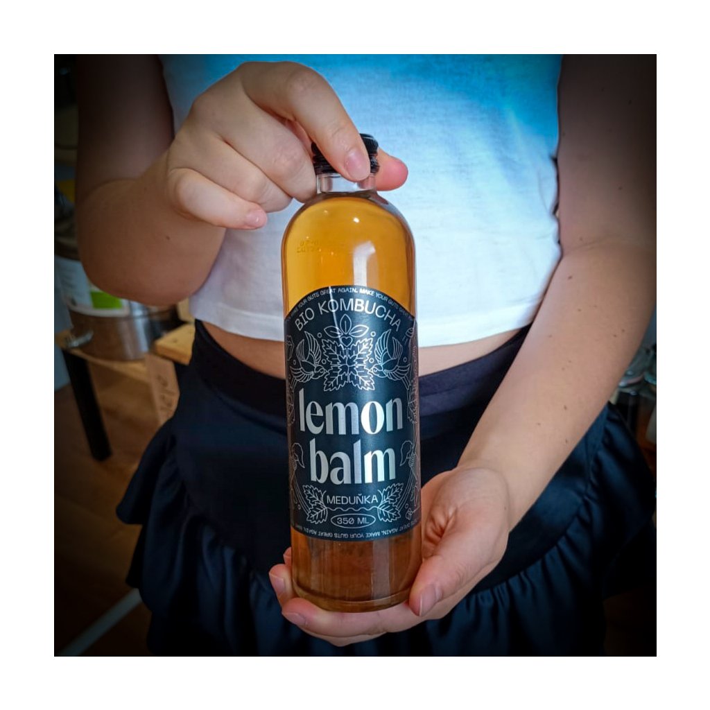 Odvar z BIO zeleného čaje a BIO meduňky 92% (voda, BIO zelený čaj, BIO meduňka 50%), BIO třtinový cukr, BIO zázvor, BIO Aloe Vera, přírodní aroma, kultury kombuchy (kvasinky a bakterie mléčného kvašení).
