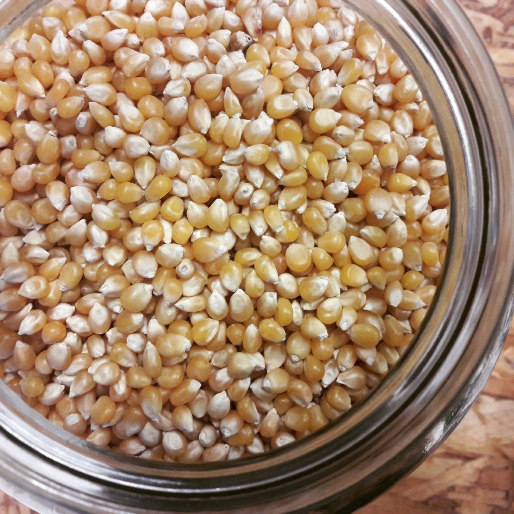 Tato kukuřičná zrna, vhodná pro přípravu popcornu, byla vypěstována v souladu s pravidly ekologického zemědělství.